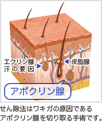 せん除法よりも広範囲に汗腺部分を切り取る手術です。エクリン腺など汗の量に関わる汗腺へも効果が期待できますが、傷跡の大きさや療養期間の長さ、わき毛の減少など効果も強まると共にデメリットになりえる要素もせん除法よりも強くなるものと考えて良いでしょう。